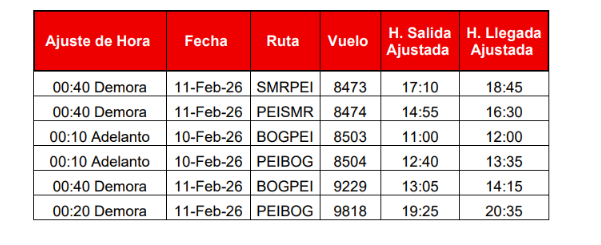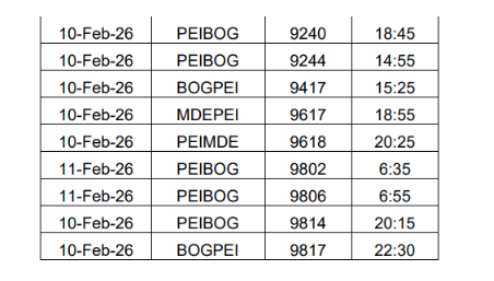 - Los itinerarios de los vuelos del 10 de febrero desde las 13:00 hasta el 11 de febrero a las 14:00 (25 horas de cierre) tuvieron que ser modificados debido al cierre de pista en el Aeropuerto Internacional Matecaña.