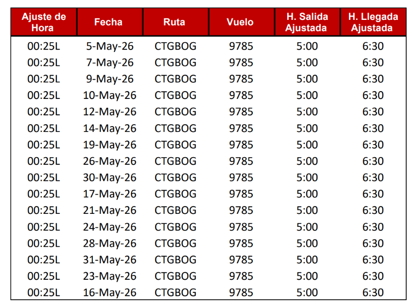 - Los itinerarios del 5 al 31 de mayo de 2026 desde las 00:00 hasta las 05:00LT tuvieron que ser modificados debido al cierre de pista en el Aeropuerto Internacional Rafael Núnez.