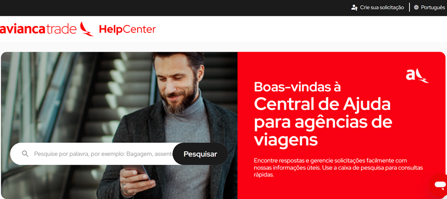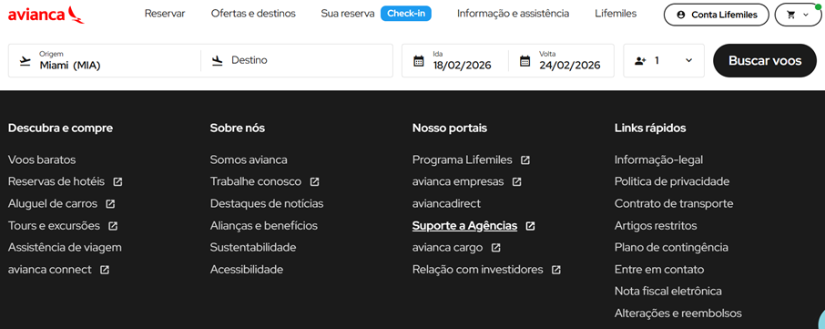 - Acesse avianca.com na parte final, clique na seção “Suporte a agências” e acesse a Aviancatrade.